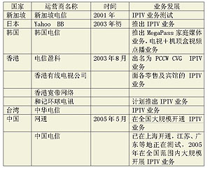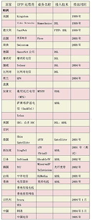 1999年,英國Video Networks公司率先在全球推出了IPTV業(yè)務(wù),此后,國外許多電信運營商先后進入IPTV市場。但在2004年之前,多數(shù)運營商僅側(cè)重于IPTV的試驗,2004年后,IPTV開始從試驗階段向商用階段轉(zhuǎn)變,許多業(yè)界人士認為,2005年將成為IPTV年。