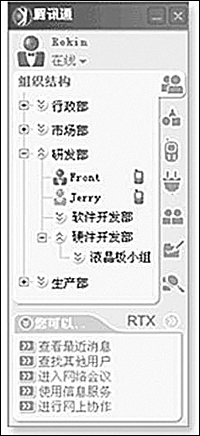 與其他應(yīng)用程序集成是EIM的發(fā)展趨勢,也是企業(yè)現(xiàn)代辦公的一大需求。目前,騰訊通RTX已成功與國內(nèi)著名的金碟、用友、北京慧點等軟件廠商開展合作,使騰訊通RTX的整體功能進一步提升,極大地方便了企業(yè)應(yīng)用。比如通過與金碟OA的集成,實現(xiàn)了企業(yè)級實時通信平臺與企業(yè)管理軟件和信息化解決方案的緊密結(jié)合,從而更好地滿足客戶需求。通過與用友ERP集成,降低了企業(yè)通信時間和費用,提高了工作效率。