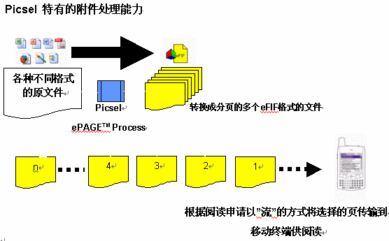在計(jì)算機(jī)上的電子郵件的各種格式文件附件無需任何特殊處理、無需同步和轉(zhuǎn)換可以在移動(dòng)終端上閱讀。并且電子郵件的附件可以被進(jìn)一步壓縮使其通過網(wǎng)絡(luò)下載更為經(jīng)濟(jì),壓縮后服務(wù)器將文件以"流"傳送,這意味著用戶無需等待一個(gè)多頁的文件完全下載完畢后再閱讀,可以選擇任何一頁下載閱讀。