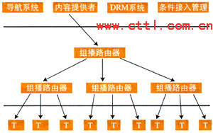 IPTV業(yè)務(wù)提供者可以根據(jù)用戶的請求,利用IP網(wǎng)絡(luò)本身所提供的組播能力將視頻信息以組播的方式傳送給用戶。此時(shí),同時(shí)向相同的業(yè)務(wù)提供者請求發(fā)送相同內(nèi)容信息的用戶,可以由業(yè)務(wù)提供者安排在同一個(gè)組播組中接收到相同的信息。為給內(nèi)容提供者提供知識產(chǎn)權(quán)保護(hù),業(yè)務(wù)提供者提供條件接入控制。同時(shí)為減少骨干網(wǎng)絡(luò)傳輸?shù)膲毫Γ瑯I(yè)務(wù)提供者在向眾多的用戶提供組播式業(yè)務(wù)時(shí)可以利用多級組播的形式來實(shí)現(xiàn)。組播式IPTV業(yè)務(wù)可能的系統(tǒng)模型示意如圖1所示。