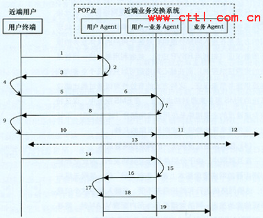 在POP點處,每類業(yè)務(wù)有一個“業(yè)務(wù)Agent”,其生命周期與運營商此類業(yè)務(wù)的生命周期相同,即從運營商開通此類業(yè)務(wù)到運營商終止提供此類業(yè)務(wù)為止,因此“業(yè)務(wù)Agent”基本上是長期存在的!皹I(yè)務(wù)Agent”負責(zé)對不同用戶的同類業(yè)務(wù)進行匯聚,統(tǒng)一與遠端的“業(yè)務(wù)Agent”進行業(yè)務(wù)交互。