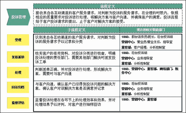 - 流程方面。投訴處理的后臺分屬不同的部門,流程不統(tǒng)一,管理和考核指標(biāo)也不統(tǒng)一; 投訴等級的標(biāo)準(zhǔn)不明確,各渠道不統(tǒng)一; 缺乏投訴升級流程,缺乏對各流程、各處理環(huán)節(jié)的時(shí)限定義。
