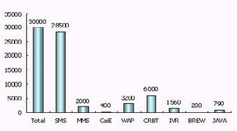 2005年,中國(guó)的移動(dòng)增值業(yè)務(wù)用戶規(guī)?倲(shù)達(dá)到了3億,其中短信用戶伴隨移動(dòng)通信用戶的穩(wěn)定增長(zhǎng)而增長(zhǎng),MMS、CaiE、JAVA、BREW等數(shù)據(jù)業(yè)務(wù)隨著終端的普及以及產(chǎn)品的豐富,增長(zhǎng)很快,以上四類數(shù)據(jù)增值業(yè)務(wù)累計(jì)用戶2005年已超過2500萬。