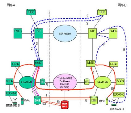 用戶(hù)A發(fā)送MM消息給用戶(hù)B。MM消息通過(guò)網(wǎng)絡(luò)A的SGSN(Serving GPRS Support Node)、GGSN(Gateway