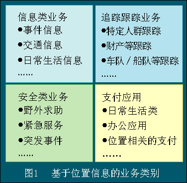 總的來(lái)講,基于位置信息的業(yè)務(wù)和應(yīng)用大體上可分為基本信息類(lèi)業(yè)務(wù)、追蹤/導(dǎo)航類(lèi)信息業(yè)務(wù)、安全類(lèi)信息業(yè)務(wù)和與金融相關(guān)的支付類(lèi)業(yè)務(wù), 如圖1所示。