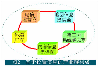 ,卻沒(méi)有一種業(yè)務(wù)被廣大人群使用。這是由于基于位置信息的業(yè)務(wù)需要取得大量的應(yīng)用層面相關(guān)的信息,進(jìn)而形成有特色的應(yīng)用。基于位置信息的業(yè)務(wù)和應(yīng)用涉及的角色比較多,所以為了有效地開(kāi)展這類(lèi)業(yè)務(wù),必須清晰地認(rèn)識(shí)其價(jià)值鏈的構(gòu)成,只有這樣,運(yùn)營(yíng)商才能有一個(gè)清晰的定位,內(nèi)容開(kāi)發(fā)和提供商才能獲得事半功倍的結(jié)果,價(jià)值鏈才能健康地發(fā)展和成長(zhǎng)。從業(yè)務(wù)提供的角度,在基于位置信息的業(yè)務(wù)環(huán)境中其產(chǎn)業(yè)鏈的組成如圖2所示。
