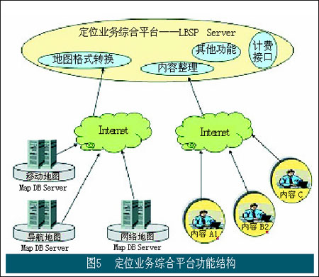 在上述結(jié)構(gòu)中,定位業(yè)務(wù)綜合平臺(tái)LBSP扮演著重要角色。其功能結(jié)構(gòu)如圖5所示。在該平臺(tái)中提供位置類(lèi)信息業(yè)務(wù)的業(yè)務(wù)運(yùn)營(yíng)支撐功能,包括計(jì)費(fèi)功能(以及和BOSS系統(tǒng)的接口);同時(shí)該平臺(tái)還扮演著接入不同內(nèi)容開(kāi)發(fā)商的重要角色。不同的內(nèi)容開(kāi)發(fā)和提供商通過(guò)該平臺(tái)向最終用戶(hù)提供具體的業(yè)務(wù)和應(yīng)用,運(yùn)營(yíng)商通過(guò)該平臺(tái)對(duì)不同內(nèi)容開(kāi)發(fā)商提供的內(nèi)容進(jìn)行管理和整理,使面向用戶(hù)的應(yīng)用能夠順利得到展現(xiàn)。該平臺(tái)提供的另一個(gè)重要角色是肩負(fù)著接入地圖信息提供商的重任,并在該平臺(tái)中通過(guò)地圖格式的轉(zhuǎn)換使不同地圖提供商所提供的地圖信息能夠以一致的格式向用戶(hù)提供。
