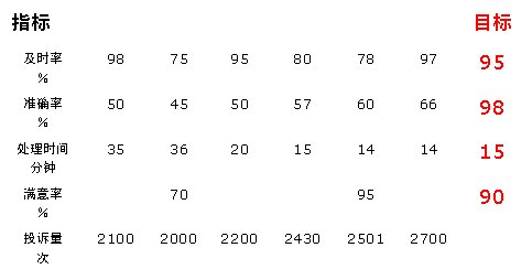 從滿意度的角度來看:5月份的指標(biāo)值已達(dá)到目標(biāo)值95%的要求,但只統(tǒng)計(jì)了2月份和5月份兩個(gè)月的數(shù)據(jù),數(shù)據(jù)收集不完整,因此,我們對(duì)該指標(biāo)無(wú)法評(píng)價(jià)(一般認(rèn)為對(duì)三個(gè)以下的數(shù)據(jù)無(wú)法做出評(píng)價(jià))。