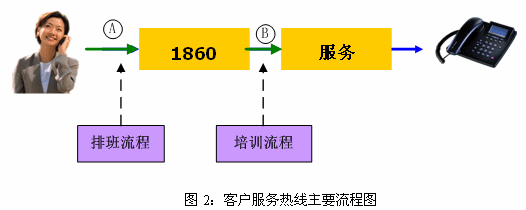 因此,根據(jù)客戶服務(wù)中心的實際情況,我們首先優(yōu)化了排班流程,建立并優(yōu)化了培訓(xùn)流程。我們首先選擇這兩個流程的思路如下:從客戶角度來看,10086熱線在接受用戶咨詢服務(wù)時的主要流程如下:撥號→1860→服務(wù)提供→掛機。圖示如下: