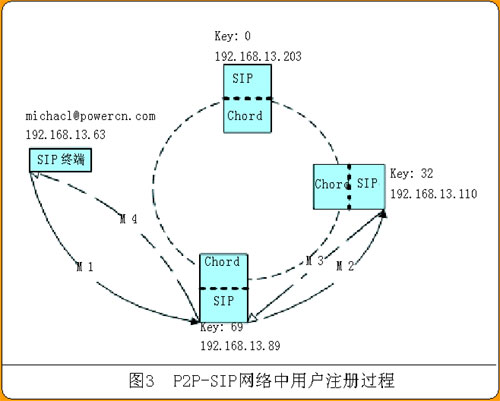 在本例中,SIP URI是michael@powercn.com,假定其哈希值是17,PN的Chord層會查找到負責處理該請求的PN Key值是32,find_responsible_pn(user)返回該PN的“IP地址∶端口”——192.168.13.110:5060。PN的SIP層比較該值發(fā)現(xiàn)不是自己,就將注冊請求轉發(fā)到該“IP地址∶端口”,如圖3中M2所示。