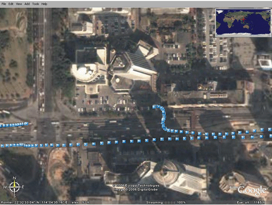 下圖顯示的是在中國(guó)深圳市進(jìn)行汽車(chē)試駕時(shí)的GPS數(shù)據(jù),利用的是Google earth應(yīng)用程序。圖中的每一個(gè)藍(lán)點(diǎn)代表一個(gè)GPS讀數(shù)。這些點(diǎn)在每隔一秒的時(shí)間內(nèi)讀出,因此,連續(xù)點(diǎn)之間的距離就代表著汽車(chē)的速度。我們甚至可以看見(jiàn)汽車(chē)駛?cè)氪髽堑耐\?chē)場(chǎng)。