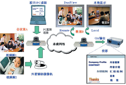 會議中常常需要同時傳送演講人的演講膠片和演講人的圖像,這套視訊系統(tǒng)非常方便地支持此功能,只需要把演講人的便攜機用線纜接到會場的終端上,通過終端的SXGA輸入功能可方便地將膠片信息發(fā)送到遠端會場,遠端會場通過終端的SXGA輸出接口將膠片內(nèi)容通過投影設(shè)備顯示出來,而終端的主視頻輸出接口顯示的是遠端演講人的圖像。