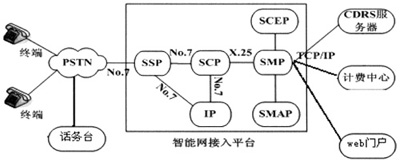 Management Point)的接入管理。SCP通過七號信令網與SSP和IP相連,通過數(shù)據(jù)鏈路(X.25)與SMP相連。SCP與SSP和IP之間的通信規(guī)程采用智能網應用規(guī)程(INAP).IP(Intelligent