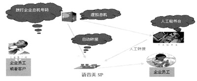 步驟五:如果用戶不知道員工分機號碼或者希望了解其他信息,主叫用戶可以選擇接入人工秘書臺。此時人工秘書臺會依據(jù)被叫號碼檢索出被呼叫集團的信息,同時根據(jù)主叫號碼檢索出主叫用戶是否為企業(yè)內部員工或者企業(yè)客戶,同時將這些信息同步更新到人工秘書臺上,話務員根據(jù)這些信息可以完成作為企業(yè)特色話務員的服務工作;