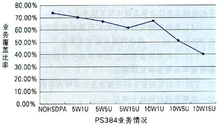 由圖1可知,當HSDPA分配功率為5W時,HSDPA對網(wǎng)絡覆蓋沒有很大影響;當它為10W時,如果HSDPA用戶數(shù)不大,影響也有限;但是,當它為10W時,如果HSDPA用戶數(shù)持續(xù)增加,則會產(chǎn)生嚴重影響。在下行從NOHSDPA的74%降低到10W15U的40.62%時,PS384業(yè)務降低了近一半。同時,隨著業(yè)務速率的提高,網(wǎng)絡影響越大。另外,在一定的HSDPA功率分配前提下,隨著HSDPA用戶數(shù)的增加,過載率增大,網(wǎng)絡中高速數(shù)據(jù)業(yè)務的比例隨之減少,各點上的用戶速率不斷降低;同時,用戶的增多使得各小區(qū)的HSDPA發(fā)射功率不斷增大,導致區(qū)域中間各點的終端接收功率普遍增加。