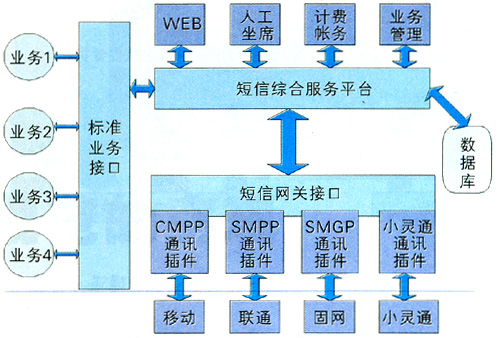 業(yè)務管理平臺是為運營商提供的可快速啟動各種數(shù)據(jù)業(yè)務的平臺,具有強大的資源調(diào)度能力。它連接運營商的基礎網(wǎng)絡和業(yè)務支撐系統(tǒng)(客服系統(tǒng)、計費系統(tǒng)),為服務提供商/內(nèi)容提供商們提供各種移動資源(如短信息中心資源、用戶信息資源、語音資源等)、功能資源(如單點認證、計費、漫游控制等)及各種公共的資源引擎(如地理位置、語音交互、推送信息等)。業(yè)務支撐系統(tǒng)是運營商為了開展業(yè)務必須建設的客服系統(tǒng)、營業(yè)系統(tǒng)、計費系統(tǒng)等子系統(tǒng)。圖3是目前常用的綜合短信平臺[3]。