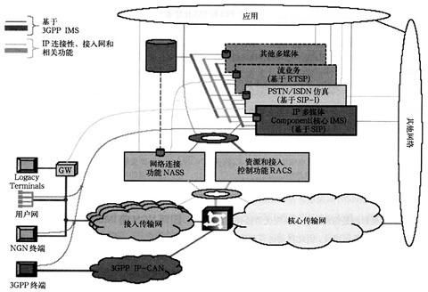 業(yè)務(wù)層包括下面的元素:PSTN/ISDN模擬子系統(tǒng)(PSS)即IMS核心子系統(tǒng)、PSTN/ISDN仿真子系統(tǒng)(PES)、其他多媒體子系統(tǒng)(如流媒體子系統(tǒng)、內(nèi)容多播子系統(tǒng)等)和應(yīng)用以及可以用于多個子系統(tǒng)的公共元素(如接入應(yīng)用、計費(fèi)功能、用戶屬性管理、安全管理和路由管理等);傳送層為用戶終端提供了基本的IP連接的能力,其中的網(wǎng)絡(luò)附屬子系統(tǒng)(NASS)和資源認(rèn)證控制子系統(tǒng)(RACS)屏蔽了IP層以下的接入網(wǎng)/核心網(wǎng)所使用的傳送技術(shù),給固網(wǎng)NGN用戶終端提供了IP的連續(xù)性。