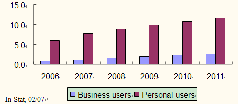 In-Stat預(yù)計,到2011年中國手機(jī)電子郵件用戶達(dá)到1400萬戶,其中企業(yè)用戶達(dá)到250萬,個人用戶達(dá)到1170萬。2007到2011年,企業(yè)用戶年均復(fù)合增長率為24.8%,個人用戶年均復(fù)合增長率為10.6%。如下圖所示: