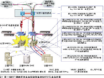 根據(jù)備份要求,相關(guān)網(wǎng)關(guān)進行了相應(yīng)的數(shù)據(jù)配置,CMNET骨干網(wǎng)北京節(jié)點交換機將北京MMSG2的端口關(guān)閉(Shutdown),同時刪除到北京MMSG2的路由,同時,放寬到北京MMSG1的路由,從218.200.243.128/27調(diào)整為218.200.243.128/26。