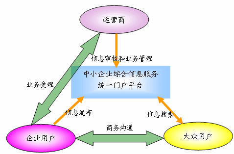 “中小企業(yè)綜合信息服務(wù)統(tǒng)一門戶平臺”的角色包括:運營商、企業(yè)用戶、大眾用戶三大角色。各角色與平臺之間及角色之間的業(yè)務(wù)關(guān)系如下: