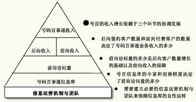 從商業(yè)模式的內(nèi)涵來分析,號碼百事通的盈利模式與市場上主流的網(wǎng)絡(luò)搜索公司的盈利模式相似,都實(shí)現(xiàn)了通過向后向商家出售推薦權(quán)進(jìn)行盈利的模式。但是,從客戶價值和運(yùn)營模式的角度,號碼百事通與搜索公司存在著本質(zhì)的不同: