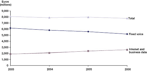 眾所周知,發(fā)達國家固話業(yè)務收益已經(jīng)持續(xù)下降了一段時間了。這與固話同移動話音業(yè)務之間不斷高漲的激烈競爭有很大的關系。因此為了減弱這種下降趨勢,有線運營商不惜大花血本投資寬帶業(yè)務。圖1的數(shù)據(jù)表明,在某種程度上,有線運營商的這一舉措也取得了成功。數(shù)據(jù)顯示,寬帶的收入是這一成功表現(xiàn)的主要因素。