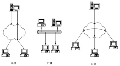 目前此類業(yè)務(wù)在IP網(wǎng)上幾乎都是采用IP組播的方式來(lái)實(shí)現(xiàn)的。IP網(wǎng)通信包括三種通信方式(如圖1所示):?jiǎn)尾ィ║nicast)、廣播(Broadcast)和組播(Multicast)。單播是指源主機(jī)向指定單個(gè)目標(biāo)主機(jī)發(fā)送數(shù)據(jù)信息,單播連接是一一對(duì)應(yīng)的,即一個(gè)發(fā)送者只能對(duì)應(yīng)一個(gè)接收者;廣播指源主機(jī)向一個(gè)網(wǎng)絡(luò)段中的所有主機(jī)發(fā)送數(shù)據(jù)信息,即該網(wǎng)段所有主機(jī)都可以接收這個(gè)數(shù)據(jù)信息;組播介于單播、廣播之間,源主機(jī)向網(wǎng)絡(luò)中特定的一組主機(jī)發(fā)送數(shù)據(jù)信息,這些主機(jī)是靠組播地址來(lái)指定的。