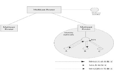 host,簡(jiǎn)稱MH)在一個(gè)子網(wǎng)中,如果要加入某個(gè)組播組,就向當(dāng)?shù)刈泳W(wǎng)的MA發(fā)送一個(gè)加入請(qǐng)求,在MA向組播路由器發(fā)送加入組播組的請(qǐng)求后,通過(guò)組播路由協(xié)議建立到該MA的組播樹(shù)。