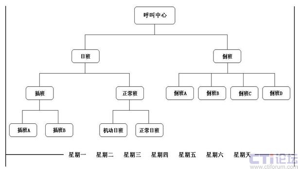 一般正常日班人員應(yīng)是機動日班人員的四倍(規(guī)模較小的呼叫中心,可不用編排機動日班人員),插班的方式可以應(yīng)付呼叫中心高峰呼叫量。這樣的班次編排,即可確保呼叫中心日間的工作覆蓋面,緩解因高峰時間而有可能對呼叫中心造成呼叫流失量的情況,亦可應(yīng)付特發(fā)事件。