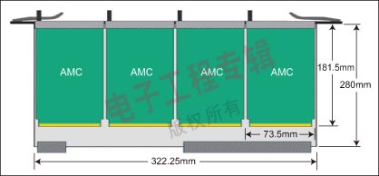 為了提高ATCA設(shè)計的模塊化性能,PICMG開發(fā)了高級夾層卡(AMC)規(guī)范。在ATVA卡上放置這些模塊后就可以使它們訪問背板連接,因此這些模塊可以用來定制ATCA卡上的I/O,并用來裝載處理器和存儲外設(shè)。一塊ATCA卡最多能夠放4個AMC模塊(見圖1),因此設(shè)計師用一個卡即可實現(xiàn)多種不同的配置。就像ATCA卡一樣,AMC模塊同樣可以實現(xiàn)單個模塊的遠(yuǎn)程系統(tǒng)管理和熱交換功能。