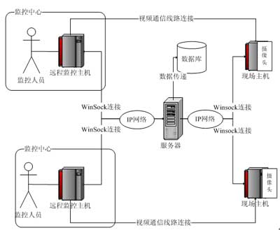 本系統(tǒng)基于瘦客戶端的C/S模式,在體系結(jié)構(gòu)上采用以服務(wù)器為中心的星型結(jié)構(gòu),創(chuàng)新性地把監(jiān)控現(xiàn)場端和監(jiān)控中心端C角色化。即在本系統(tǒng)中所有的監(jiān)控現(xiàn)場端和監(jiān)控中心端相對整個系統(tǒng)的架構(gòu)而言都是客戶端,它們的通信都需要經(jīng)過服務(wù)器的驗證中轉(zhuǎn)。同時,監(jiān)控中心使用者的登錄由于這種架構(gòu)模式,也必須要經(jīng)過服務(wù)器的驗證才能成功登錄,進(jìn)而獲得監(jiān)控的權(quán)利。