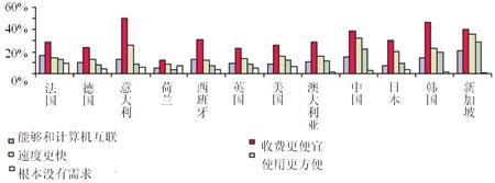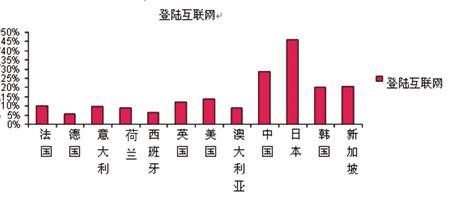 手機(jī)上網(wǎng)也受到一些用戶(hù)的歡迎,這得益于一些運(yùn)營(yíng)商為促進(jìn)移動(dòng)互聯(lián)網(wǎng)的推廣而越來(lái)越多地采取了手機(jī)上網(wǎng)打包套餐。此外,不同地區(qū)的用戶(hù)對(duì)使用手機(jī)上網(wǎng)的偏好不同,調(diào)查顯示,亞洲國(guó)家用戶(hù)使用手機(jī)上網(wǎng)的比例高于歐洲國(guó)家用戶(hù)。其中,日本的被調(diào)查者通過(guò)手機(jī)上網(wǎng)的比例明顯超過(guò)平均水平,這離不開(kāi)NTTDoCoMo公司i-Mode的成功。有意思的是,中國(guó)緊隨日本排名第二,這有可能是因?yàn)橐苿?dòng)通信在中國(guó)的普及率并不高,目前的用戶(hù)對(duì)技術(shù)的領(lǐng)悟能力大大超過(guò)了其它國(guó)家的平均水平,也有可能是因?yàn)橐恍┍徽{(diào)查者用手機(jī)替代了固定電話(huà),手機(jī)成為其上網(wǎng)的惟一途徑(見(jiàn)圖3)。展望未來(lái),Ovum認(rèn)為該領(lǐng)域充滿(mǎn)了期待。