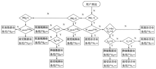 1)用戶到達(dá)事件。當(dāng)帶寬資源充裕時(shí),各類用戶到達(dá)不論優(yōu)先級(jí)高低,均可按需分配得到帶寬。當(dāng)帶寬資源不能滿足接入需求帶寬時(shí),則按照優(yōu)先級(jí)順序從低到高對(duì)已接入的用戶進(jìn)行QoS降級(jí)服務(wù)(降一級(jí)或若干級(jí)),直到能夠騰出足夠的帶寬滿足新用戶的需求,否則阻塞該用戶,具體流程如圖2所示。