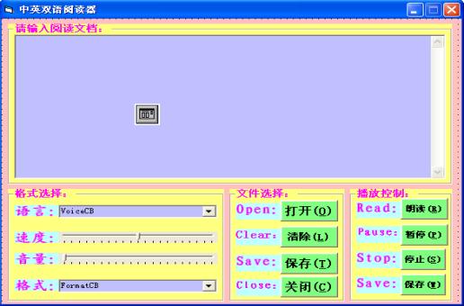 、“清除(L)” 、“保存(T)”和“關(guān)閉(C)” ,分別用來(lái)打開(kāi)要閱讀的文件、清除MainTxtBox中的內(nèi)容、保存MainTxtBox中的內(nèi)容和關(guān)閉中英文閱讀器;在Frame4添加四個(gè)Label控件,將它們的Caption分別命名為分別“Speak”