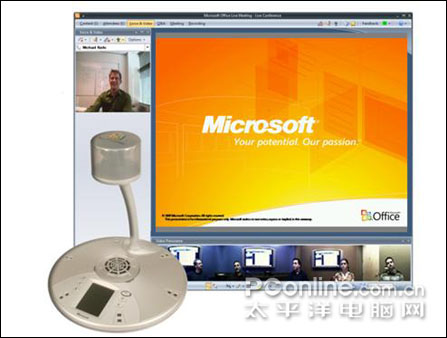 微軟Office RoundTable,音頻-視頻協(xié)作設備,帶有一個獨特的 360 度相機。在結合 Office Communications Server 2007 使用時,RoundTable 還可交付卓越的會議體驗:將會議環(huán)境擴展到多個位置。現(xiàn)場及遠程位置的與會人員可以全景查看會議室中的每位成員,還可以在輪流發(fā)言時拉近特寫某個與會者。