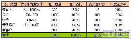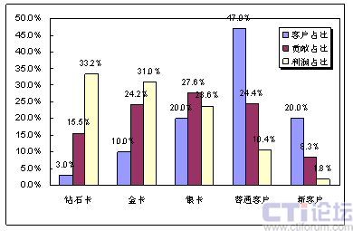 因?yàn)楦叨丝蛻粼诶麧欂暙I(xiàn)中所起的巨大作用,通過簡單的計算即可得出,每一名鉆石卡客戶流失帶來的利潤損失,相當(dāng)于9.4名銀卡客戶流失帶來的損失,或相當(dāng)于50名普通客戶流失帶來的損失,或相當(dāng)于125名新用戶流失帶來的直接損失。