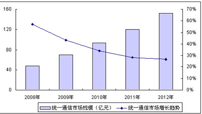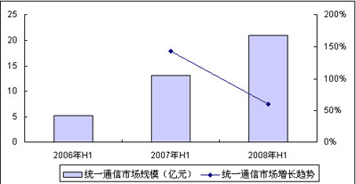 統(tǒng)一通信作為一種以融合技術為基本特征的特定解決方案和應用,通過對各種溝通方式進行有效的融合,滿足用戶方便快捷的信息獲取和溝通需求,近年來在全球范圍內得到了迅猛發(fā)展,各大通信與信息技術相關廠商紛紛加入統(tǒng)一通信市場的競爭中。賽迪顧問數據統(tǒng)計顯示,2008年上半年,中國統(tǒng)一通信整體市場規(guī)模已達到21.01億元,同比增長超過60.9%,繼續(xù)保持強勁的增長勢頭。