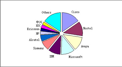各大通信與IT廠商都在厲兵秣馬,充分挖掘企業(yè)的自身優(yōu)勢,準備在潛力巨大的統(tǒng)一通信市場中取得良好戰(zhàn)績。賽迪顧問數據顯示,2008年上半年,中國統(tǒng)一通信市場中,Cisco公司以15.3%的市場份額繼續(xù)保持領頭樣的位置,在通信設備領域,Nortel和Avaya分別以12.1%和11.7%的市場份額緊隨其后。值得一提的是Microsoft和IBM以其在全球獨一無二的終端用戶,迅速占領統(tǒng)一通信軟件市場,無論是市場份額還是整體競爭力都成績不俗,且增長勢頭強勁。各大廠商短時間的涌入,使得統(tǒng)一通信市場出現了前所未有的群雄逐鹿的局面,競爭異常激烈。