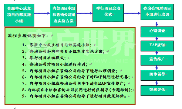 2007年11月,中國移動江蘇公司客戶服務(wù)中心EAP計劃正式啟動,這是中心為全體員工獻上的一份特別的“精神福利”。 EAP(Employee Assistance Program),中文被譯為“員工幫助計劃”,是由組織為其成員設(shè)置的一項長期的、系統(tǒng)的援助和福利計劃。它源于20世紀(jì)40年代的美國,目前美國中型和大型企業(yè)的EAP普及率為60―70%,英國有將近113個組織提供EAP服務(wù)、2200萬員工享受EAP服務(wù),而在我國近年來也有許多企業(yè)開始運用EAP服務(wù),中國陸續(xù)召開了三屆EAP年會,越來越多的企業(yè)開始關(guān)注員工的心理健康。