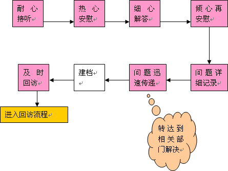 a、 呼叫中心在回訪、投訴應(yīng)答、咨詢應(yīng)答過程中存在的問題,應(yīng)當(dāng)及時(shí)的轉(zhuǎn)遞到相關(guān)的部門。