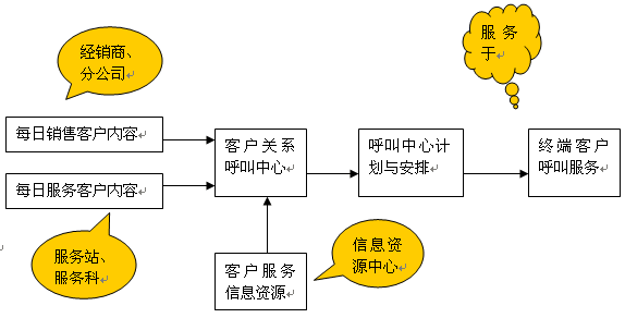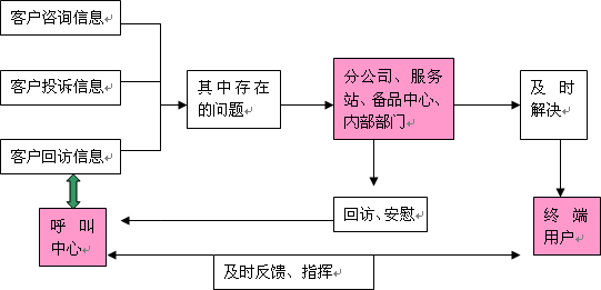 呼叫中心的回訪呼叫工作、咨詢服務(wù)呼叫和問題投訴呼叫需要掌握大量的客戶信息資源和公司的產(chǎn)品與服務(wù)政策信息,而這方面的信息需要由客戶購(gòu)車過程、維修過程和公司內(nèi)部的相關(guān)部門提供。