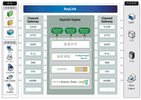 通過(guò)基于AnyLink的電子渠道統(tǒng)一接口平臺(tái)解決方案提供各類(lèi)網(wǎng)關(guān)功能,可實(shí)現(xiàn)各種系統(tǒng)的整合,還提供報(bào)文轉(zhuǎn)換及路由的中介功能、管理和監(jiān)控所需的GUI工具,實(shí)現(xiàn)系統(tǒng)運(yùn)營(yíng)和維護(hù)及開(kāi)發(fā)的最佳化(如圖所示)。