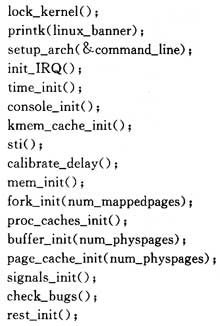 在系統(tǒng)啟動后,最先調(diào)用的是針對32位微處理器MCF5249的特定的arch文件夾內(nèi)mmcontr.S文件。最后跳到main.c中的start_kernel()。μClinux/Linux-2.4.X/init/main.c中包含了對Linux系統(tǒng)初始化的代碼。其中stan_kernel()包含主要的初始化代碼。