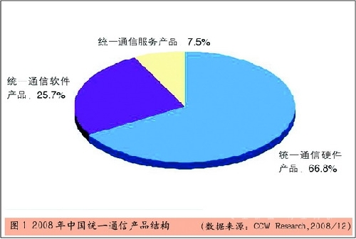 從產(chǎn)品結(jié)構(gòu)角度分析,雖然受硬件設(shè)備價格因素的影響,統(tǒng)一通信設(shè)備市場仍然是通信市場中最大份額的一部分,市場份額占到66.8%。而且隨著企業(yè)用戶對于統(tǒng)一通信理解能力的加深,統(tǒng)一通信軟件產(chǎn)品與統(tǒng)一通信服務(wù)越來越受到更多企業(yè)的認同。與2007年相比,統(tǒng)一通信軟件和服務(wù)產(chǎn)品市場份額有一定比例的增加。2008年,統(tǒng)一通信軟件產(chǎn)品達到市場份額的25.7%,特別是統(tǒng)一通信服務(wù)產(chǎn)品,增長迅速,市場份額超過7.5%。