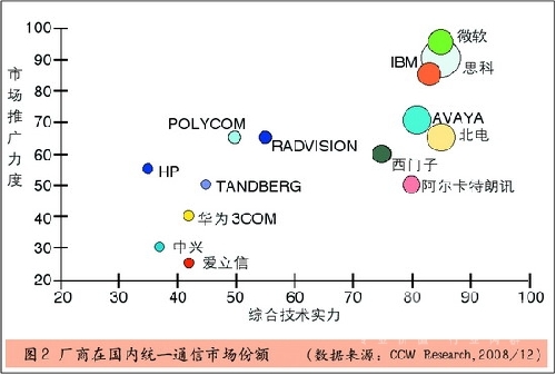 從當(dāng)前國內(nèi)統(tǒng)一通信市場競爭格局來看,在綜合技術(shù)實力方面,根據(jù)廠商所提供的統(tǒng)一通信解決方案中所能夠提供的各種溝通方式融合的程度以及每個具體功能技術(shù)水平等綜合因素考慮,處于前幾位的分別是思科、微軟、北電、IBM和Avaya,它們的產(chǎn)品線比較長,產(chǎn)品功能也相對比較全面。