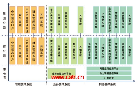 從系統(tǒng)部署來看,目前各大運營企業(yè)都以集團與省公司為主要的建設(shè)與管理維護單位,建成了集團與省兩級模式的支撐系統(tǒng)。集團公司的系統(tǒng)主要提供面向全公司的企業(yè)管理、經(jīng)營分析等功能;省公司從職能管理單位逐步轉(zhuǎn)向了兼顧管理、生產(chǎn)的單位,具有了越來越多的生產(chǎn)職能,在運營支撐系統(tǒng)建設(shè)中的作用較為突出,一般情況下,在遵循集團公司的總體指導思想下,可自行規(guī)劃與建設(shè)本省的支撐系統(tǒng);市公司的生產(chǎn)職能有所削弱,主要負責市場營銷、客戶支撐以及設(shè)備的現(xiàn)場維護等工作,因而主要是支撐系統(tǒng)的使用單位。