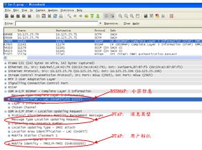 以上是一個用戶開機的信令過程,在BSSMAP消息層中,可以獲取CGI=0X0457-2222;在DTAP消息層中,可以獲得獲得本次消息類型為LocationUpdatingREQ,同時用戶標識為TMSI=0X8c000093,通過對對之前或之后(簽權、IDREQ/RSP)等信令的關聯(lián),可以獲得用戶IMSI、MSISDN和CGI的對應關系。其它信令過程,如周期性位置更新、短信收發(fā)、主被叫等,和以上分析過程類似。