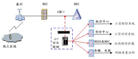 A口信令檢測的應用非常廣泛,如網(wǎng)絡質(zhì)量分析系統(tǒng)、小區(qū)短信、小區(qū)彩信、垃圾短信攔截等。這些正成為通信運營商的業(yè)務增長點。其業(yè)務應用組網(wǎng)圖如下: