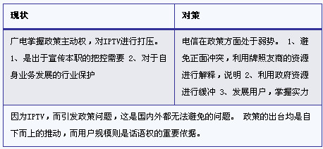 IPTV目前遇到的廣電阻力,主要源于和廣電有線網(wǎng)絡(luò)公司所推進(jìn)的數(shù)字電視的業(yè)務(wù)競爭,而有線網(wǎng)絡(luò)通過和廣電局的關(guān)聯(lián)關(guān)系,引發(fā)IPTV政策干擾和內(nèi)容屏蔽。