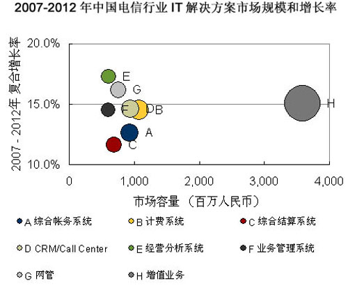 巨大的電信市場(chǎng)蛋糕給產(chǎn)業(yè)鏈的各級(jí)廠商都帶來良好的發(fā)展機(jī)遇,而其運(yùn)營(yíng)支撐系統(tǒng)市場(chǎng)無疑將是增長(zhǎng)最快的一部分。據(jù)市場(chǎng)調(diào)查機(jī)構(gòu)IDC預(yù)計(jì),2007年-2012年電信行業(yè)將注重運(yùn)營(yíng)支撐系統(tǒng)的全業(yè)務(wù)運(yùn)營(yíng)整合和支持前端業(yè)務(wù),因此3G增值業(yè)務(wù)、經(jīng)營(yíng)分析系統(tǒng)、客戶關(guān)系管理系統(tǒng)、IT服務(wù)管理系統(tǒng)等建設(shè)將實(shí)現(xiàn)快速增長(zhǎng)。運(yùn)營(yíng)商的已有項(xiàng)目仍然會(huì)持續(xù)升級(jí)維護(hù),以及配合全業(yè)務(wù)運(yùn)營(yíng)作出功能上的提升。IDC預(yù)計(jì),2012年電信行業(yè)IT解決方案整體市場(chǎng)規(guī)模將達(dá)到193.5億元人民幣。